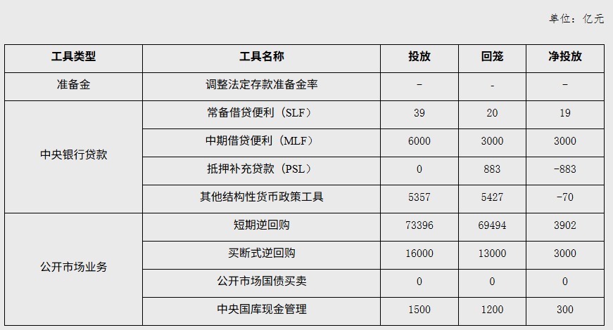 其中,短期逆回购净投放3902亿元,买断式逆回购净投放3000亿元,公开市场国债买卖净投放0元,中期借贷便利(MLF)净投放3000亿元,抵押补充贷款(PSL)净回笼883亿元。