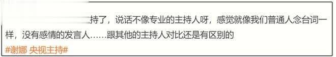 有网友认为谢娜看着不像专业主持人,感觉很久没主持了,说话和普通人念台词没什么区别,完全是一个“没有感情的发言人”。